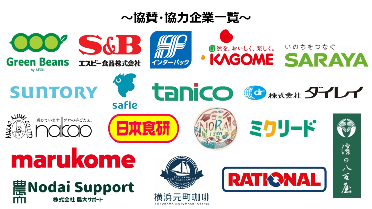 | 協力 | (50音順)エフピコインターパック株式会社/サントリー株式会社/セーフィー株式会社/株式会社ダイレイ/タニコー株式会社/中尾アルミ製作所/日本食研株式会社/株式会社農大サポート/NORAism(ノライズム)/濱の八百屋/株式会社ミクリード/横浜元町珈琲/株式会社ラショナル・ジャパン |