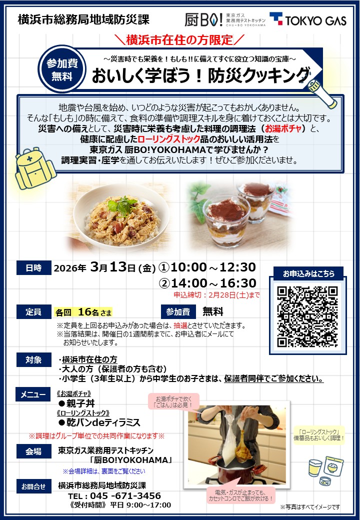 3/13(金) 【横浜市民限定・無料】\調理実習付き/ おいしく学ぼう!防災クッキング