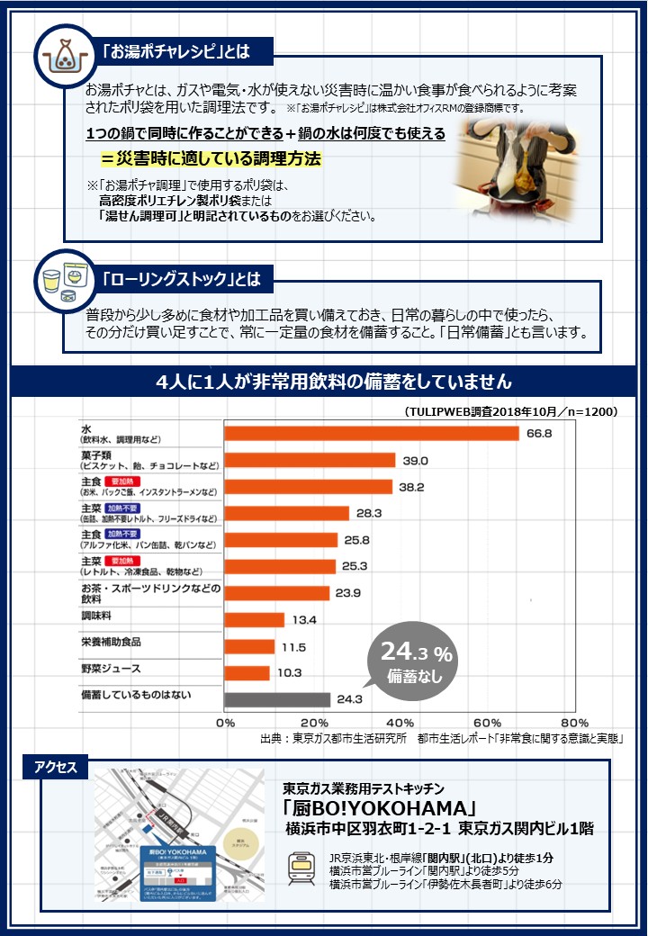 | 主催 | <主催>横浜市総務局地域防災課 <運営>厨BO!YOKOHAMA( 東京ガス株式会社 カスタマー&ビジネスソリューションカンパニー ) <運営>東京ガスエンジニアリングソリューションズ株式会社 都市エネルギー営業本部 ビジネスカスタマー営業部 |