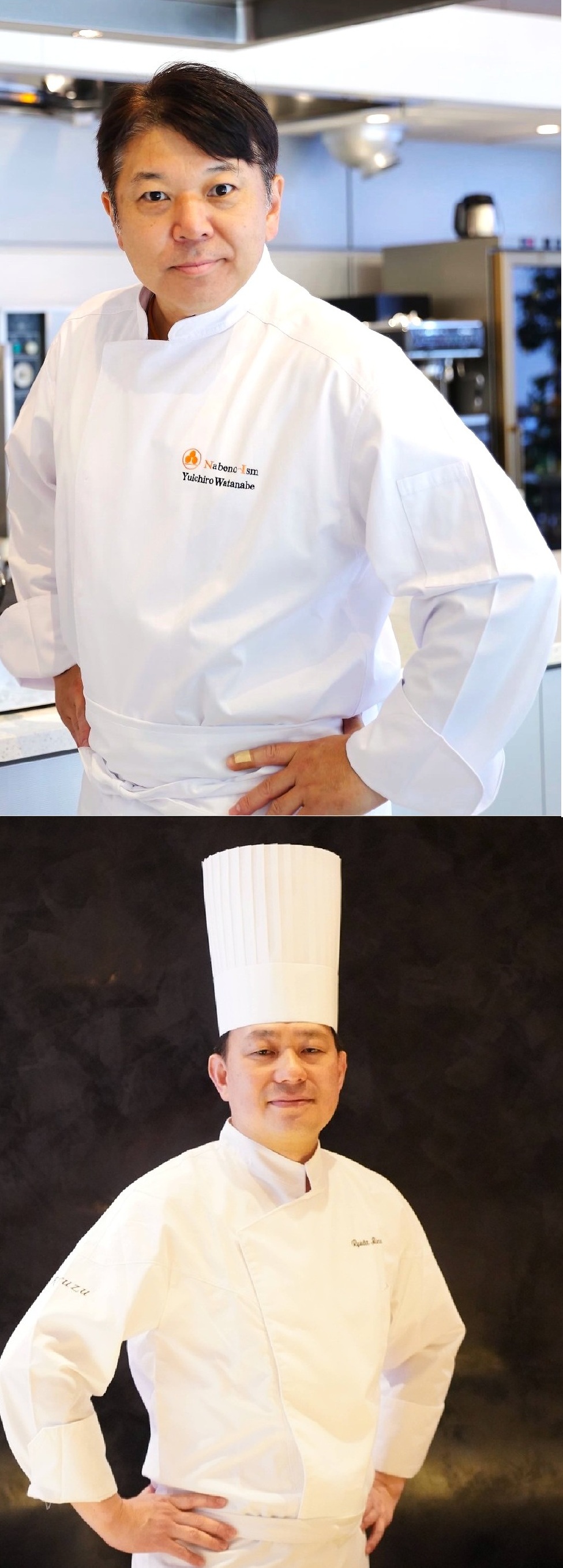 今回講師を務めていただくのは、渡辺 雄一郎シェフ(Nabeno-Ism)と飯塚 隆太シェフ(Restaurant Ryuzu)です。1994年のシャトーレストラン「タイユヴァン・ロブション」のオープン時から、「世紀のシェフ」と称されたジョエル・ロブション氏の元で共に腕を磨いてこられたお二人。現在はそれぞれ独立され、人気を誇る名店のオーナーシェフとしてまた日本のフレンチ界を牽引する立場として活躍しておられます。
