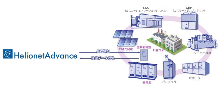 TGESでは太陽光発電やコージェネレーションシステムなど様々なエネルギー設備と、それらを最適マネジメントするシステム(Helionet Advance)を取り扱っています。