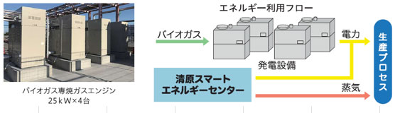 ・25kWのバイオガス専焼ガスエンジン4台により工場内の排水処理工程で発生するバイオガスを燃料として発電し、再生可能エネルギー由来の電力を自家消費します。