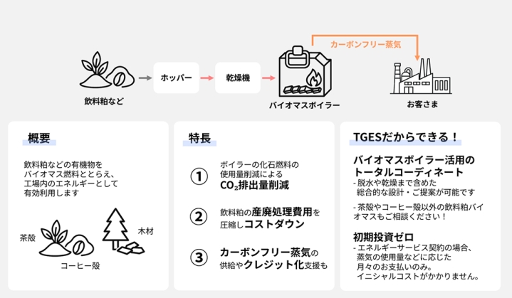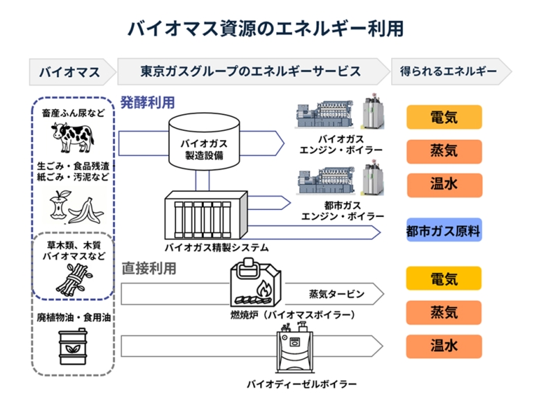 バイオマスは、その性状や用途に応じた方法でエネルギーに変換されます。 バイオガスを製造、精製、利用する機器を組み合わせることで、電気、蒸気、温水、さらに都市ガス原料としても利用できます。 お客さまのご要望・ご利用形態に合わせた機器を選定し、最適なエネルギーサービスをご提案します。